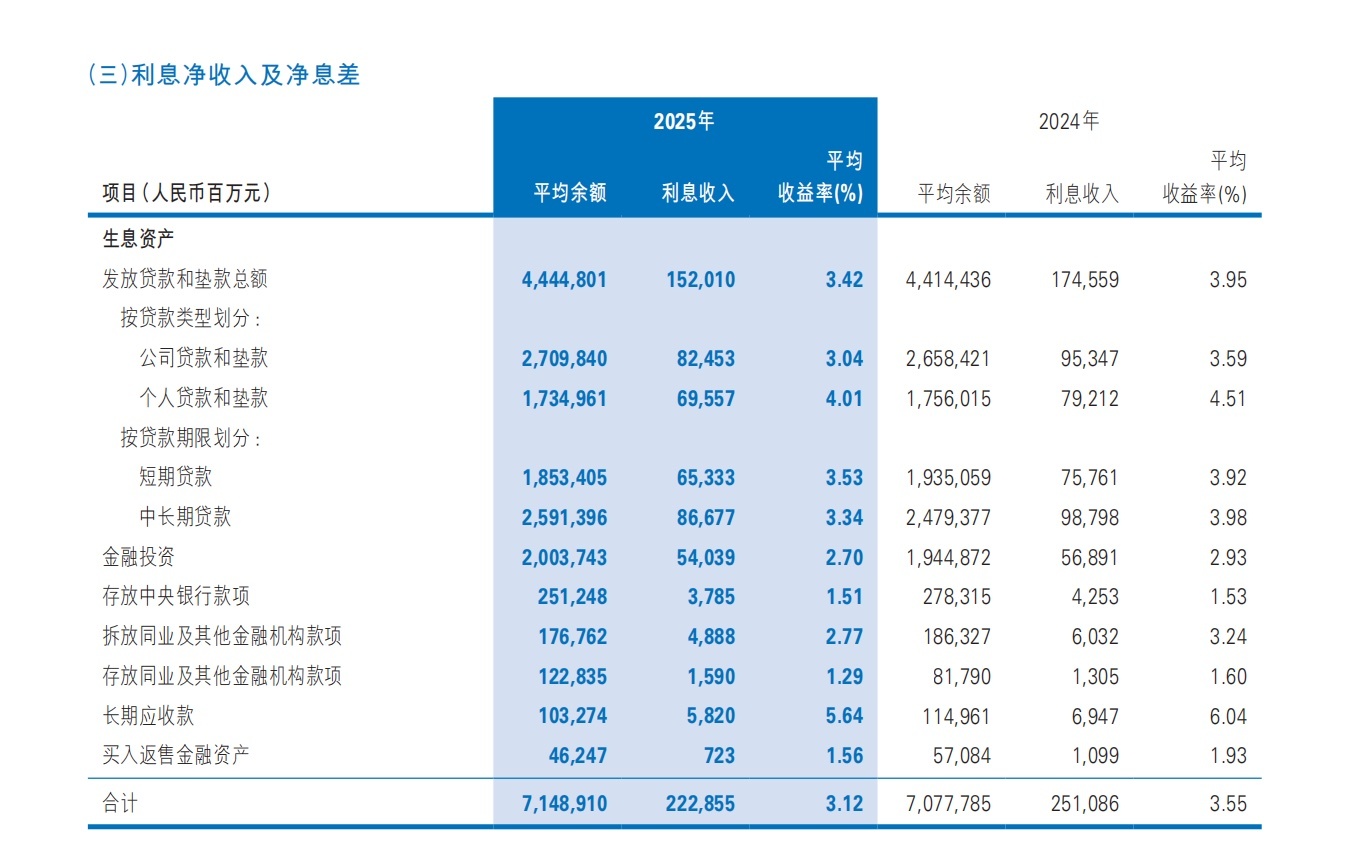 这一数字背后是贷款综合收益率的全面下滑:公司贷款平均收益率从3.59%降至3.04%,个人贷款从4.51%降至4.01%,短期贷款从3.92%降至3.53%,中长期贷款从3.98%降至3.34%。市场化利率下行、存量房贷重定价、实体经济融资成本压降政策等多重因素叠加,使得贷款端的利率侵蚀已成结构性现实。