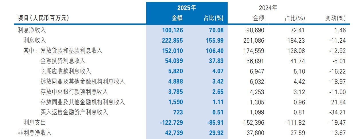 非利息净收入表现较为突出,达427.39亿元,同比增长13.67%,营收占比从27.59%提升至29.92%,其中投资收益贡献较大,显示该行在市场行情回暖期间加大了金融资产的主动管理力度。
