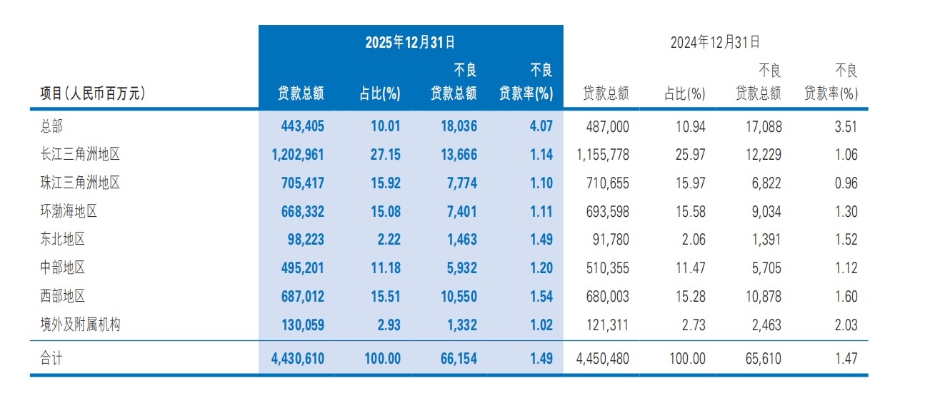 区域分布上,长江三角洲和珠江三角洲分别较上年末增加不良14.37亿元和9.52亿元,不良率各上升0.08和0.14个百分点,这两大传统优质区域不良的抬头,反映出中小企业经营压力与个人消费信贷违约在经济承压背景下的蔓延。总部不良贷款180.36亿元,主要集中于信用卡业务,也显示零售风险向头部机构传导的特征。关注类贷款余额1,211.95亿元,占比2.74%,较上年末小幅上升。