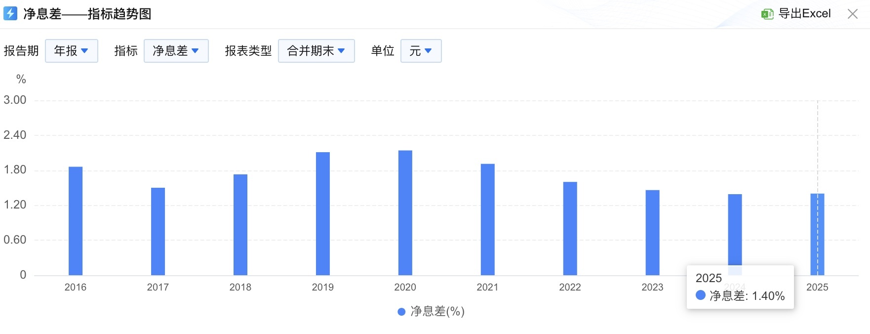 从收入结构看,利息净收入为1,001.26亿元,同比仅增1.46%,主要依赖生息资产规模温和扩张,而非利率端的改善。净息差为1.40%,同比微升1个基点,虽在行业普遍承压的背景下保持稳定,但仍处于历史低位,较2021年的1.91%收窄逾50个基点。