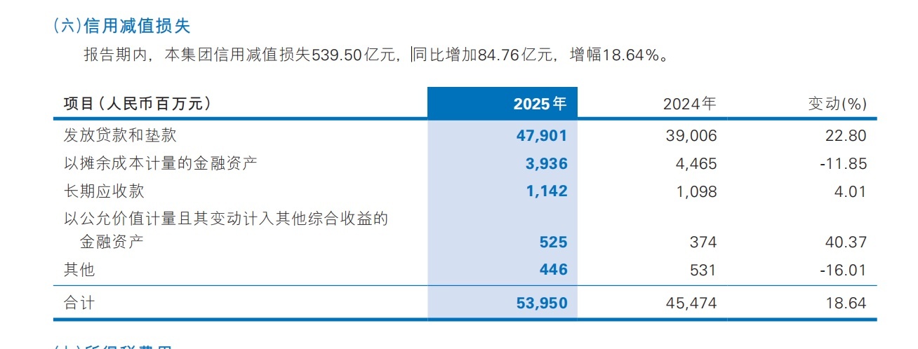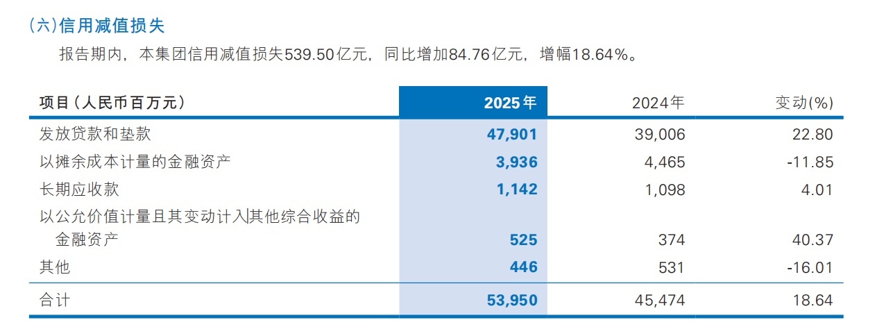 损失类贷款的跳升值得警惕,截至2025年末,余额达413.36亿元,较上年末增加79.86亿元,增幅23.58%;而次级类和可疑类贷款则分别下降30.92%和9.37%。这种“两端反向”的变化,反映出银行主动加速存量不良的下迁与核销,以清洁资产负债表,但代价是当期信用减值损失被直接推高。2025年信用减值损失高达539.50亿元,同比增加94.76亿元,增幅18.64%,成为侵蚀净利润的首要因素。