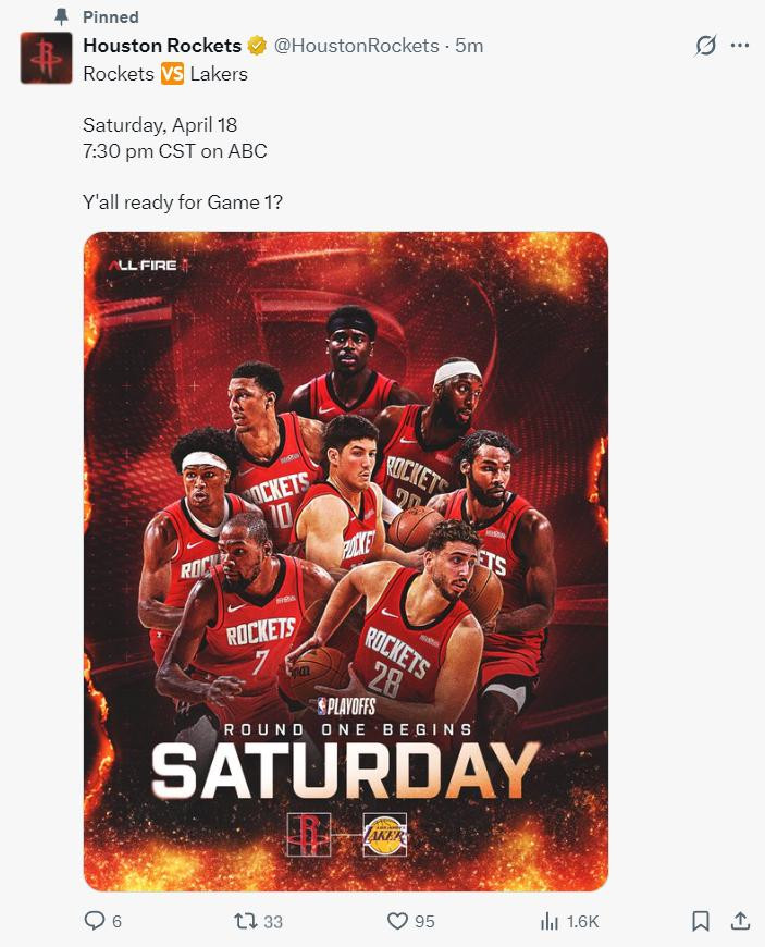 湖人击败爵士,掘金击败马刺,火箭大胜灰熊,最终西部3-6的排名确定,掘金、湖人、火箭、森林狼,所以湖人首轮要打火箭,湖人手握主场优势,目前湖人官方已经写出4月18日将在主场对阵休斯顿火箭队。