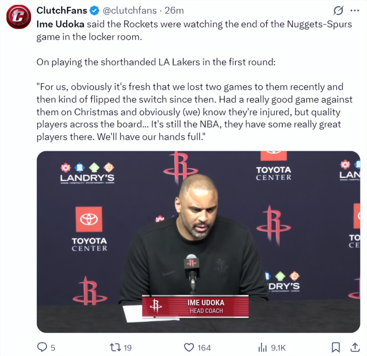 乌度卡接受采访谈到首轮面对阵容不整的湖人队,乌度卡这边说道: